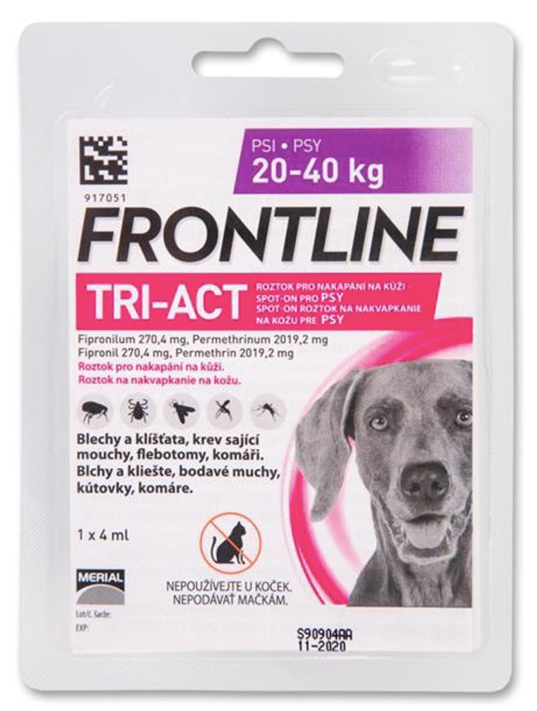 Antiparazitická pipeta Frontline TRI-ACT spot-on Dog je vhodná pro velká plemena psů 20 – 40 kg. Roztok pro nakapání na kůži je určen k léčbě a prevenci napadení blechami, klíšťaty, komáry nebo všenkami. Zabíjí blechy do 24 hodin.