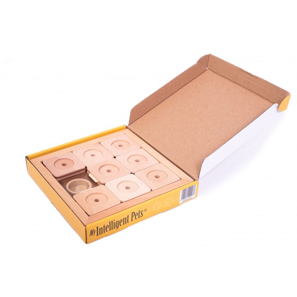 - Vzhledem k vysokému stupni obtížnosti buďte trpěliví a pokud se pejskovi samotnému nedaří, s hlavolamem mu pomáhejte, aby ho neřešil zbrkle a nebyl frustrován neúspěchem.