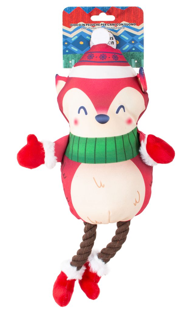 Plyšová liška s jemnými vánočními detaily. Lanové končetiny nabízejí psovi zábavu při přetahování, zatímco měkké tělo je příjemné na mazlení.