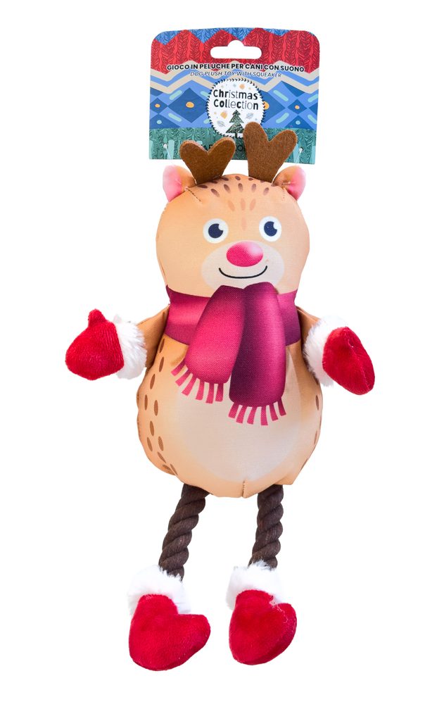 Vánoční plyšový sob s parůžky a výraznými sezónními barvami. Lanové nožičky jsou vhodné pro tahací hry i aportování. Odolný společník na sváteční období.