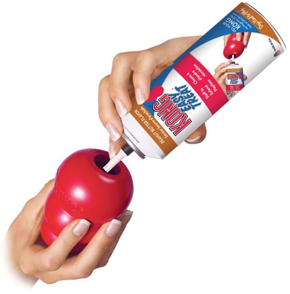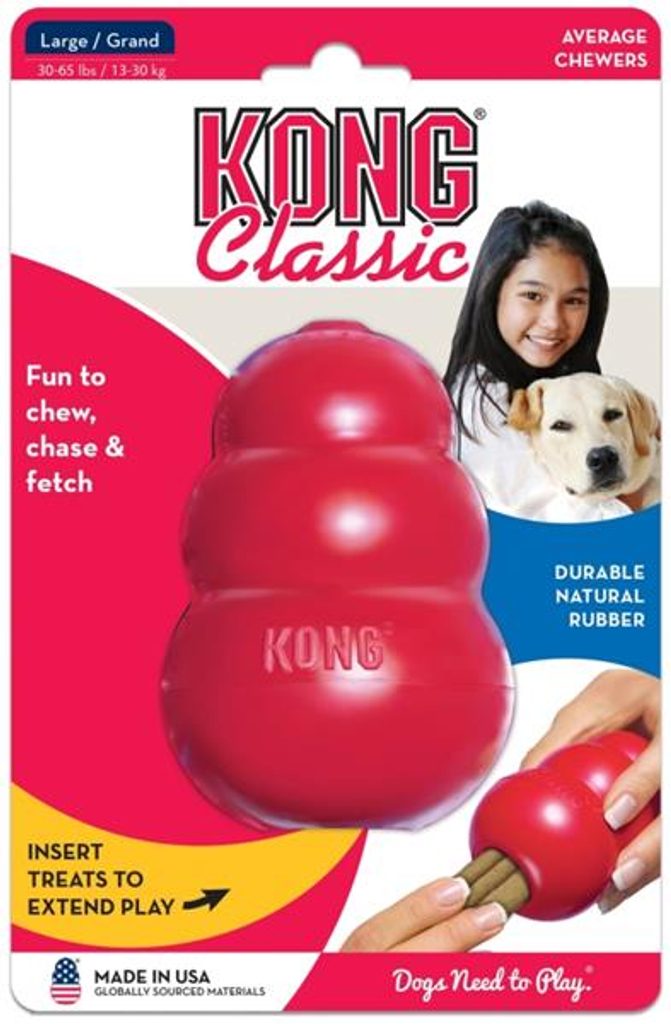Hračka KONG je interaktivní plnitelná hračka pro psy ze speciální odolné gumy. Je vyrobena z ultra elastického, čistě přírodního kaučuku, který je velmi pružný a zároveň velmi odolný a pevný i pro největší ničitele hraček. Speciální tvar zajišťuje při dopadu nepravidelný odraz. Hračku lze naplnit pamlsky nebo pastou a zvýšit tak zájem psa o hračku.