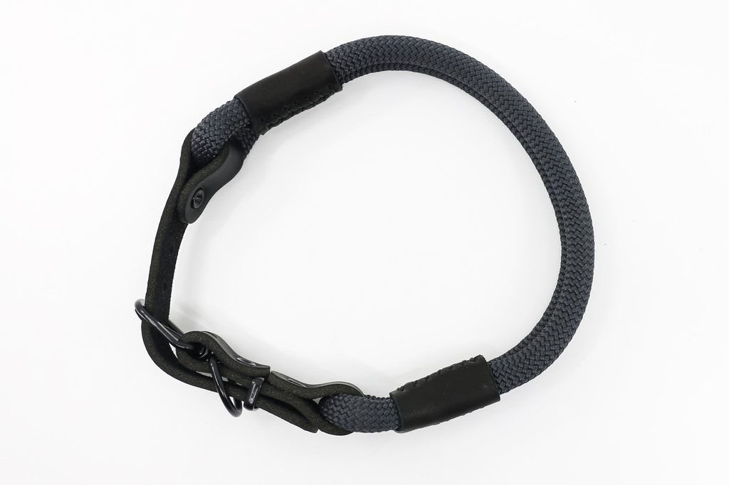 Ručně vyrobený obojek z horolezeckého lana a pravé kůže s černým kováním