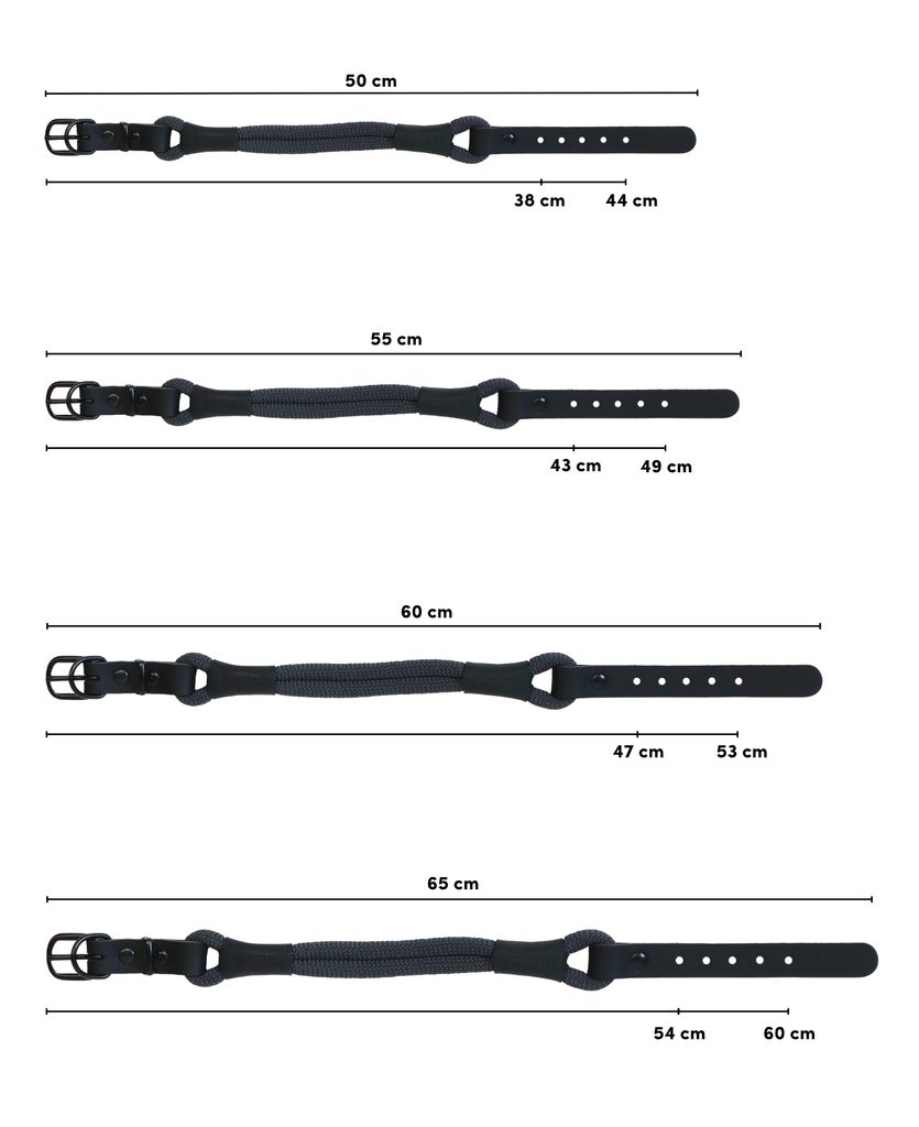 Obojky jsou vyráběny z pevného horolezeckého lana, které zaručuje vysokou odolnost a dlouhou životnost a jsou doplněny o prvky z pravé kůže, které dodávají obojku elegantní vzhled.