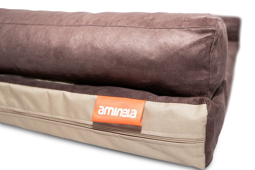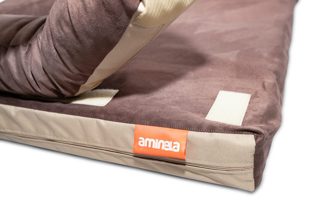 Matrace Aminela se skládá z dvou odolných materiálů, z voděnepropustného materiálu a měkkého, hebkého, avšak pevného a voděodpudivého materiálu, který nešustí a pro psa je velmi pohodlný. Ze stejně hebkého a pohodlného materiálu je vyroben okraj, který se na matraci přichytí pomocí suchých zipů. Kdykoliv se dá okraj odlepit a zase nalepit.