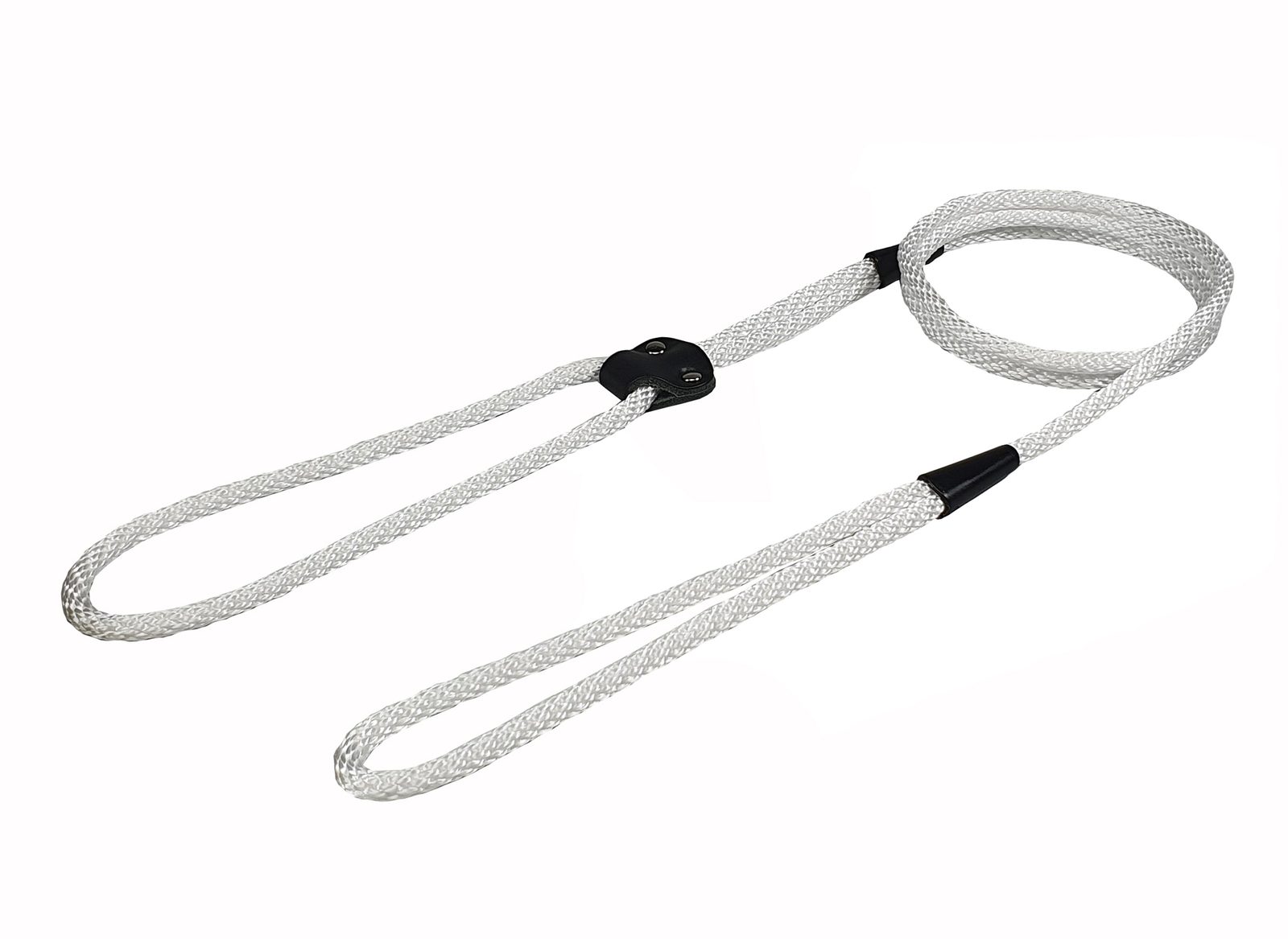 Na jednom konci se nachází pohodlné ucho pro snadné držení, na druhé straně nastavitelná smyčka, jejíž velikost lze upravit pomocí praktické kožené vsuvky. Toto vodítko je ideální pro výstavní použití, kdy je důležitá kombinace funkčnosti, pevnosti a decentního vzhledu.
